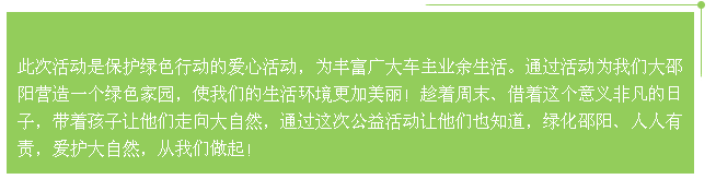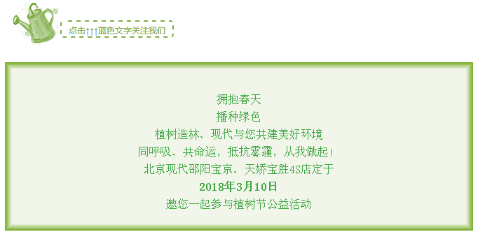 趕緊帶上家人、孩子加入北京現代邵陽(yáng)寶京、天嬌寶勝4S店舉行的綠色家園植樹(shù)自駕游活動(dòng)吧!