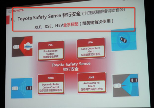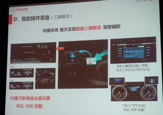 配置方面,根據早前獲得的車(chē)型信息介紹圖片,新車(chē)將全系標配電子駐車(chē)系統、自動(dòng)駐車(chē)、全車(chē)10個(gè)SRS氣囊(主/副駕駛席氣囊、前排側氣囊、前排膝部氣囊、側氣簾、后排側氣囊)。此外,在XLE、XSE兩款車(chē)型中將標配10英寸彩色抬頭顯示屏、7英寸TFT MID行車(chē)電腦等配置。同時(shí),在HEV車(chē)型中將配備自動(dòng)化性控制系統(AGC:Auto Glide Control)以及采用了全新開(kāi)發(fā)的Hyper Prime Nicke電池等。值得一提的是,未來(lái)根據車(chē)型配置的不同還將配備全景監控系統(PVM)和并線(xiàn)盲點(diǎn)監測系統(BSM)配置。