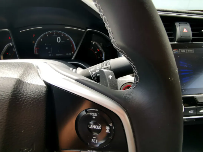 新款思域在老款的基礎上,新增了一套模擬換擋撥片,為駕駛體驗再添幾分姿色。儀表盤(pán)的整體造型不變,但儀表盤(pán)顏色由之前的藍色變?yōu)榧t色,表明了它的特殊身份。