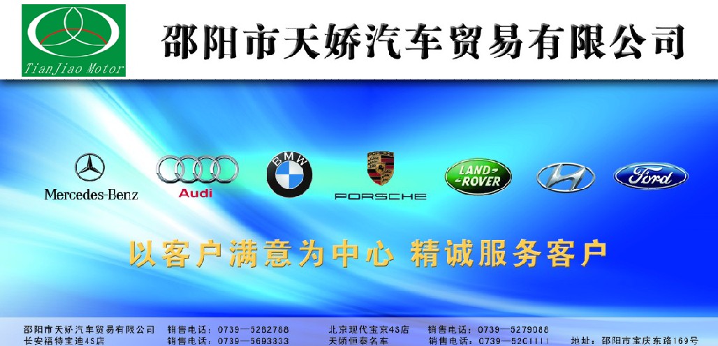 經(jīng)湖南省邵陽(yáng)市人民政府批準,邵陽(yáng)市第四屆汽車(chē)博覽會(huì )定于2011年9月23日至9月25日在邵陽(yáng)市魏源廣場(chǎng)隆重舉行。本次車(chē)展由邵陽(yáng)電視臺主辦、邵陽(yáng)市汽車(chē)行業(yè)商會(huì )、邵陽(yáng)市交警協(xié)辦,30余家汽車(chē)經(jīng)銷(xiāo)商共同參與的一次盛大的汽車(chē)博覽會(huì ),天嬌集團旗下的寶迪4s店,寶京4s店,恒泰名車(chē)店經(jīng)營(yíng)有奧迪、奔馳、寶馬、保時(shí)捷、路虎、現代、福特,屆時(shí)恭迎您的大駕光臨。