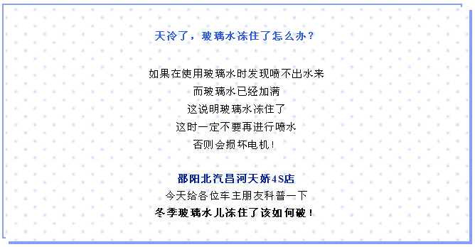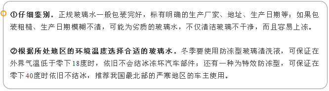 如果太陽(yáng)曬不開(kāi),也可以在玻璃水水箱中加一些溫水(不可以加開(kāi)水),待化開(kāi)玻璃水后,盡快將水排出,以免再次凍住,然后加入冬季專(zhuān)用玻璃水。