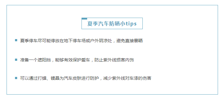 說(shuō)了這么多的愛(ài)車(chē)曬傷現象,接下來(lái)小編為大家雙手奉上夏季汽車(chē)防曬小tips,我們大家一起,好好防曬
